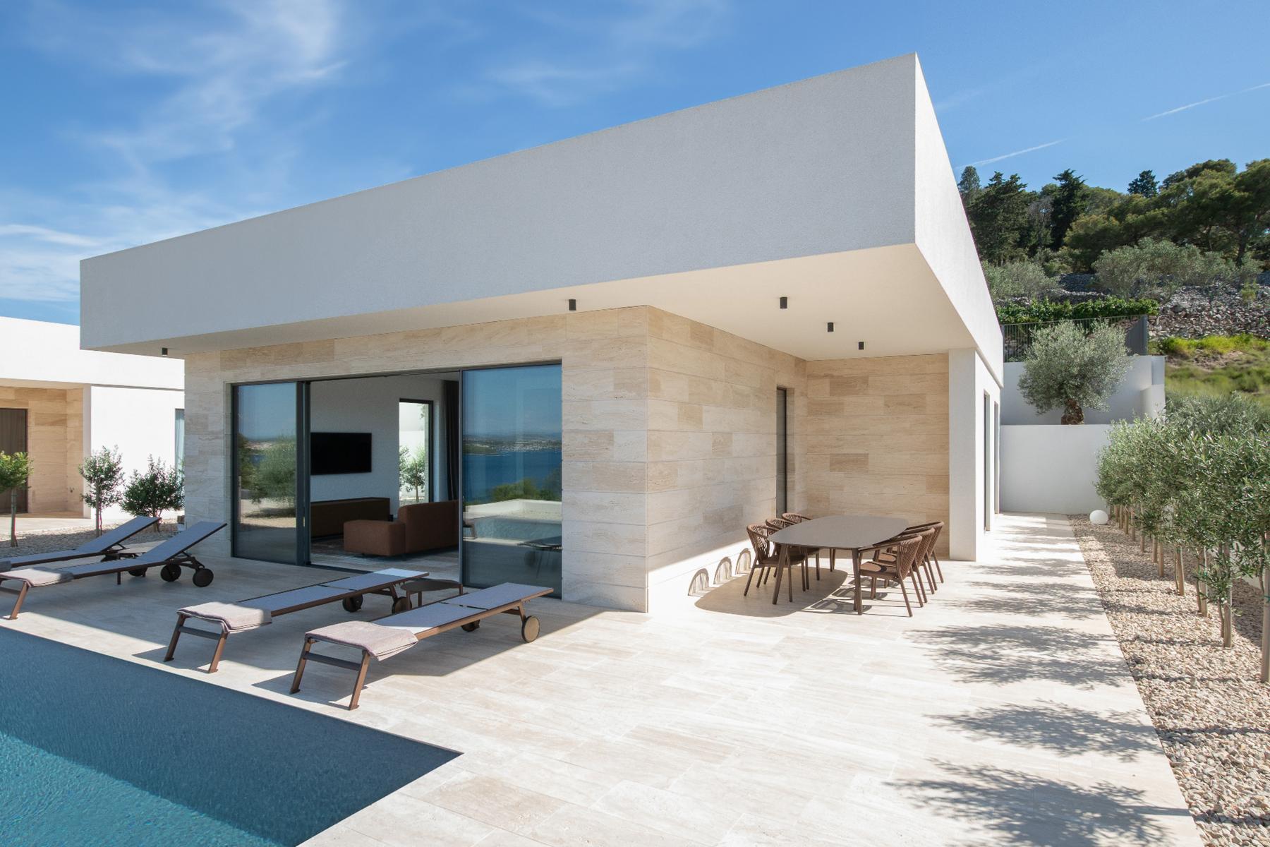 Къщата е заобиколена от големи тераси с обща площ над сто квадратни метра, които са идеални за отдих на открито. В центъра на вниманието е частният басейн, облицован с естествен травертин, който създава приятна зона за релакс на фона на средиземноморския пейзаж. Благодарение на тази комбинация от вътрешно пространство и външна зона, имотът ще удовлетвори дори най-взискателните хора, които ценят уединението и високото качество на изпълнение.