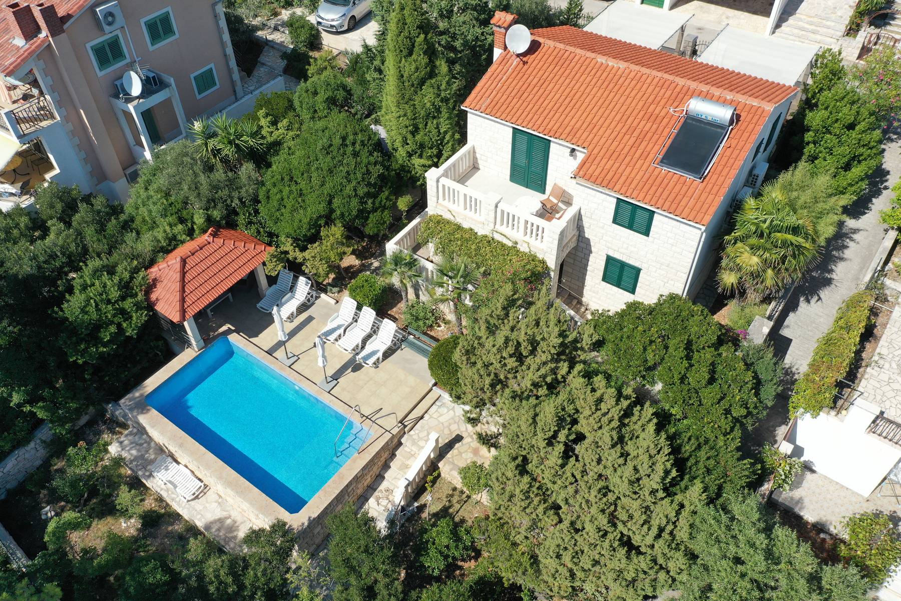 Зоната за релакс на терасата, вдъхновена от средиземноморската простота, се простира към юг, осигурявайки ненарушени гледки и места за срещи с семейство или приятели. Около къщата се простира ограден парк с каменни стени и железна ограда, който гарантира безопасност и комфорт за живущите. Съчетавайки природата с близостта до всички удобства, този обект е отличен избор както за семейства, така и за хора, търсещи втори дом в южна Европа.