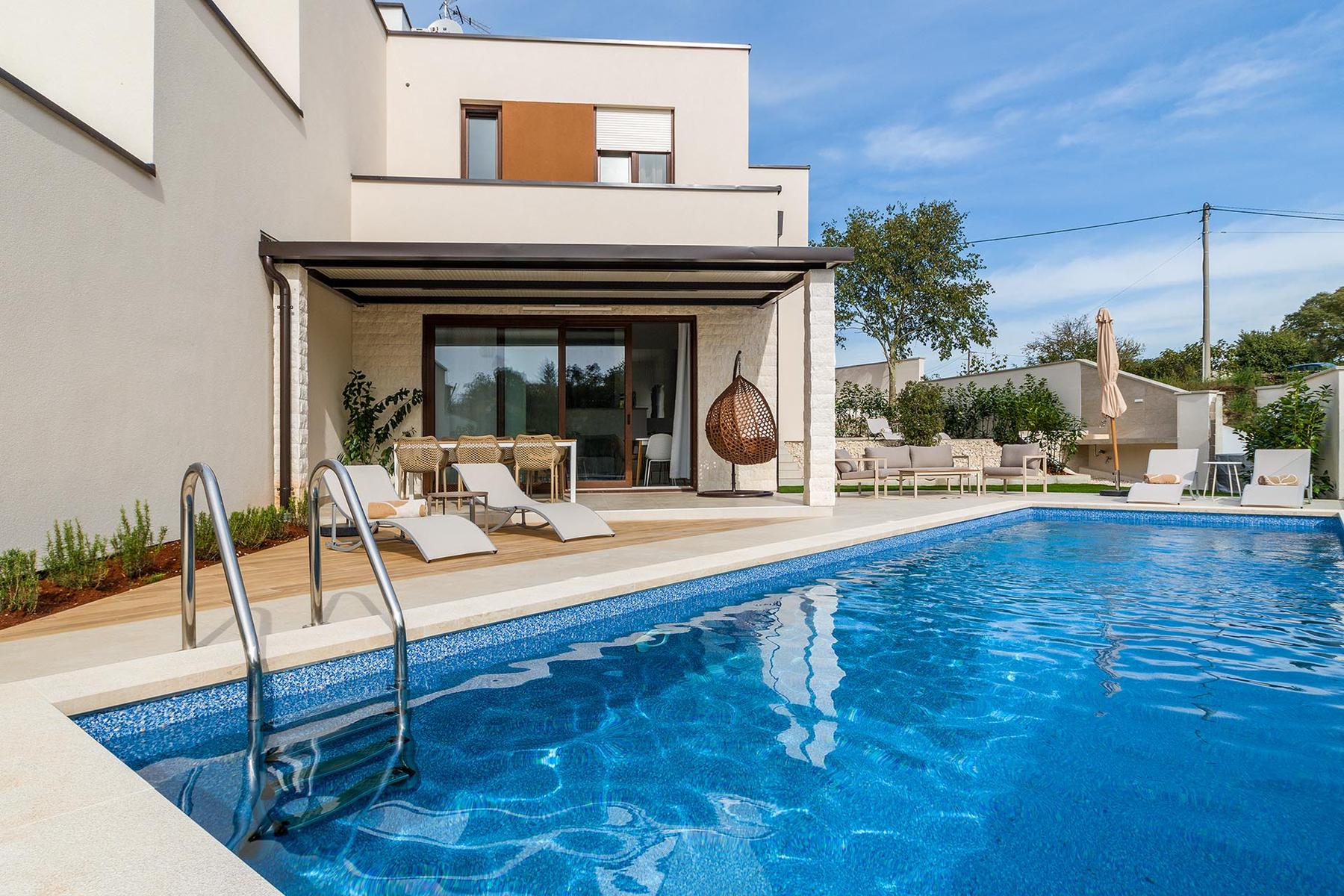 Представеният имот е модерен полуобездвижен блок, разположен на периферията на живописното село Светвинченат, на място, гарантиращо тишина и контакт с природата. Отличното местоположение на обекта осигурява едновременно бърз достъп до историческия център на населеното място и близост до важното летище в Пула, намиращо се на около 25 километра. Сградата с площ над 140 м2 включва два етажа, създавайки просторен и функционален интериор, идеален за семейства или хора, търсещи комфортен ваканционен дом.