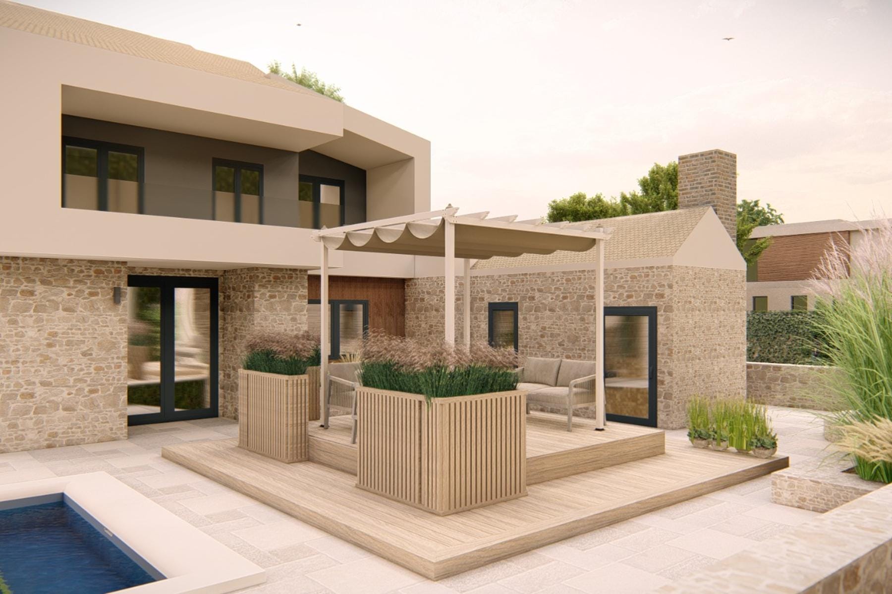 На приземния етаж има отворено дневно пространство, съчетаващо кухня, трапезария и хол, което насърчава общуването между обитателите. Освен това тук се намират спалня, баня и отделна тоалетна за гости. От този етаж се излиза на тераса, която приканва към отдих на открито. Етажът предлага три отделни спални, всяка със собствена баня, както и две просторни тераси. Използваните строителни материали са от най-високо качество, а външните стени са облицовани с естествен камък, придаващ здравина и естетика на сградата.