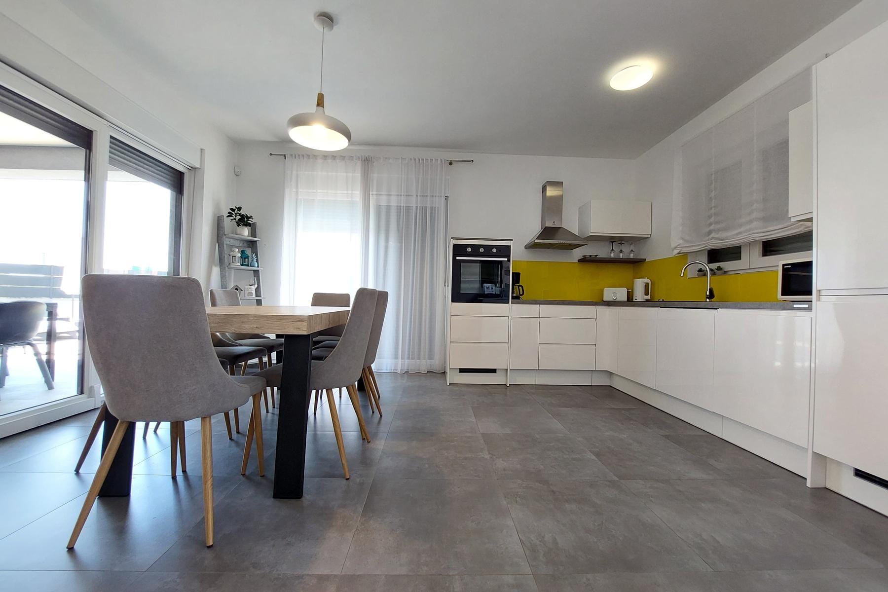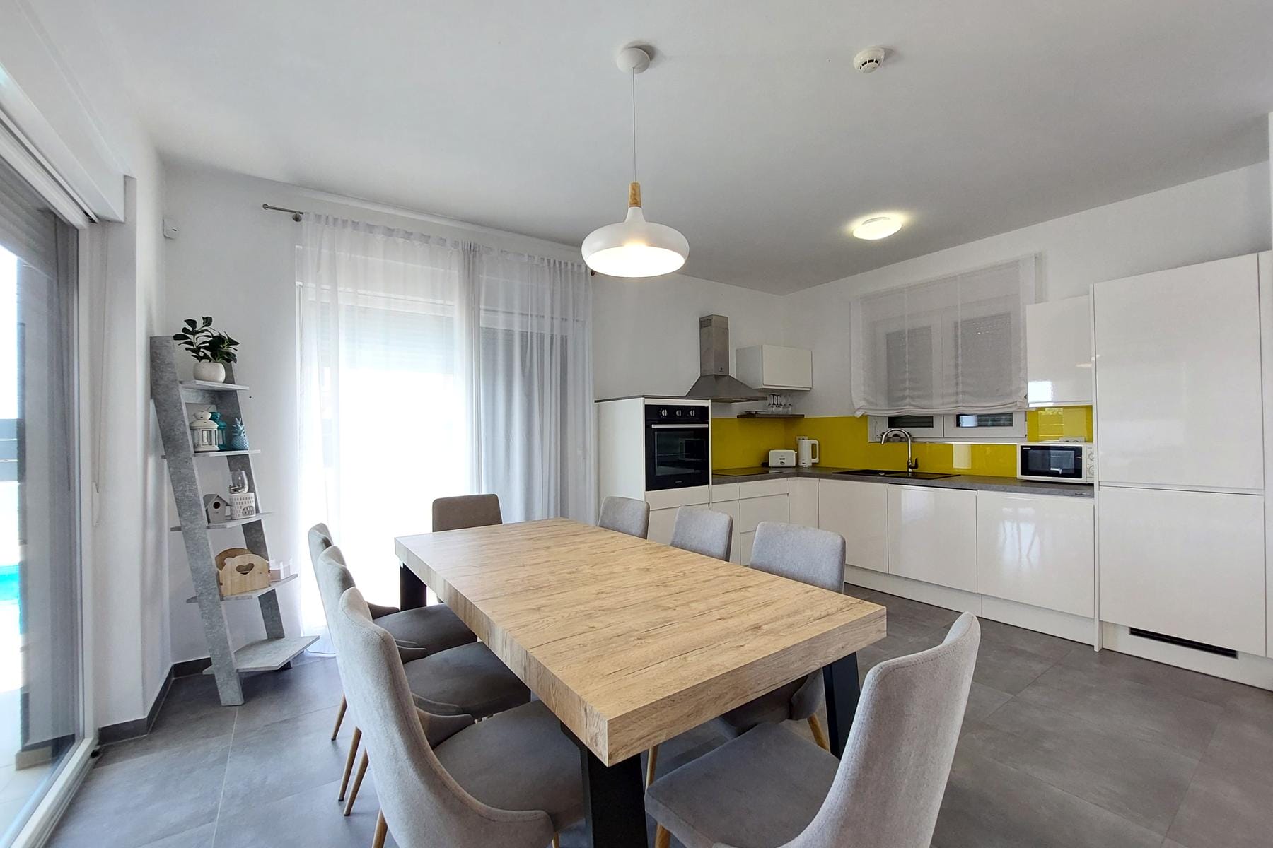 Предлаганият за продажба е модерен, двуетажен дом, разположен недалеч от град Пула, в тиха и спокойна околност. Сградата с полезна площ от 172 м² осигурява комфортно пространство за живот на семейство, което цени уединението и релаксацията. Партерният етаж е проектиран като отворено пространство, съчетаващо дневната, кухнята и трапезарията, което подчертава функционалността на интериора и насърчава общуването. Излизайки на покритата тераса, може свободно да се ползва домашната градина и басейн с площ 32 м², идеален особено в по-топлите дни.
