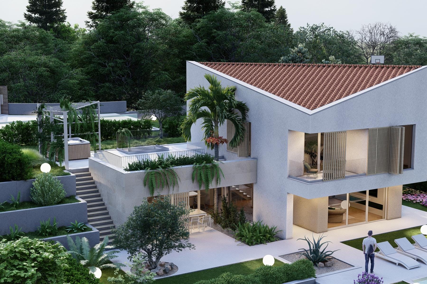 Сградата е разпределена на два етажа. Партерът е проектиран с мисъл за удобство – предлага просторни и луксозно обзаведени помещения, които осигуряват комфорт и функционалност. Горният етаж дава възможност да се наслаждавате на обширни гледки към Адриатика, които са отличен фон за ежедневните моменти на релакс. Търсеният имот ще удовлетвори изискванията на взискателни клиенти, които желаят да съчетаят лукса с близостта до природата.