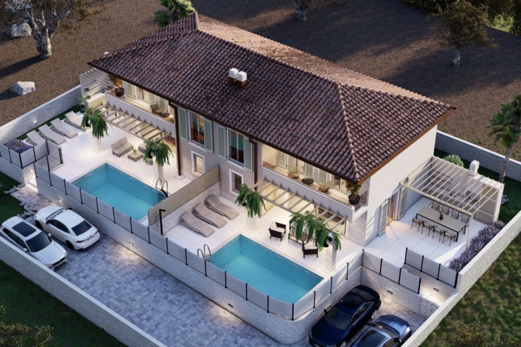 Партера включва просторна дневна с изход към терасата, свързана с модерна кухня. В тази част има също баня и помещения за гости. На първия етаж са проектирани две спални със собствен достъп до допълнителни бани. Цялото пространство осигурява много естествена светлина и свобода при аранжирането.