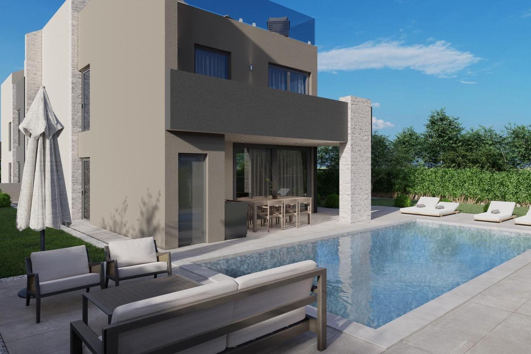 Тази модерна вила се намира на хълм близо до центъра на града и плажа. От терасата ѝ се разкрива ненарушена гледка към морето и околните зелени площи. Жилищната площ е проектирана с мисъл за комфорт и простор. На приземния етаж има отворена кухня, трапезария и хол с достъп до покрита тераса, която е отлично място за отдих и семейни събирания. На този етаж се намират също така практични помощни помещения и тоалетна за гости.