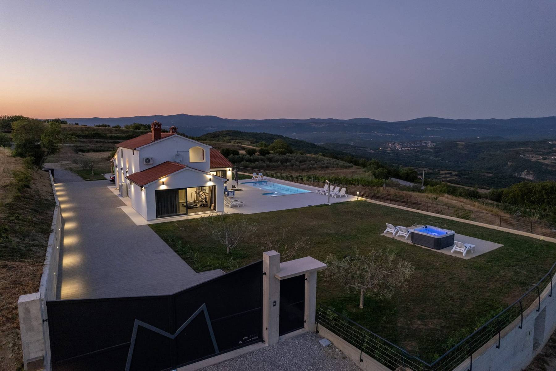 Тази изключителна вила, разположена на периферията на очарователно село в околностите на Бузет, е място, където комфортът се съчетава с тишина и естествена красота. Имението се намира на голям парцел, който осигурява пълна поверителност и свобода за отдих. От всяко място в къщата и на територията на имота се открива обширна гледка към живописния пейзаж на Истрия, който впечатлява с разнообразието и спокойствието си.