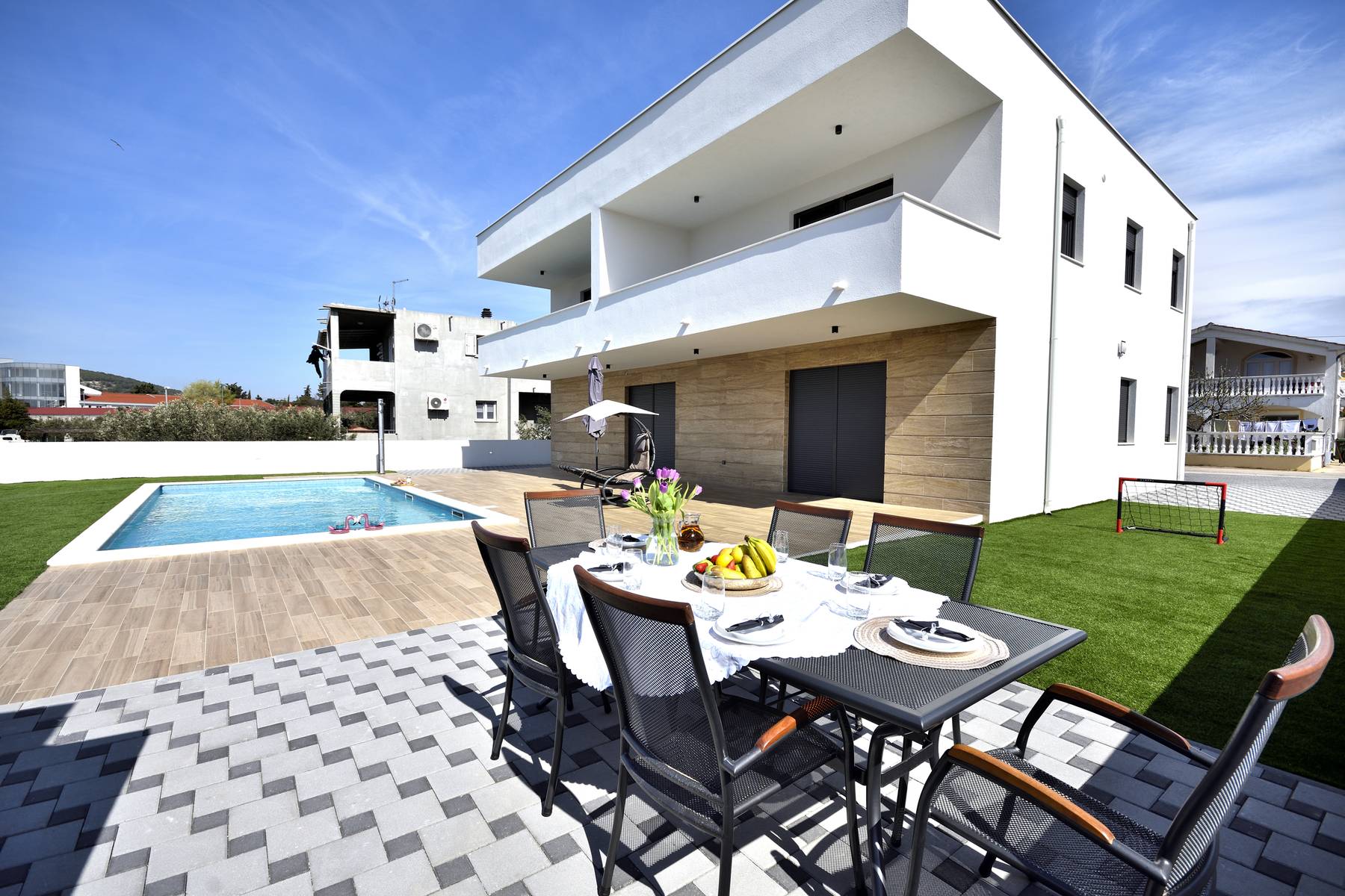 Разположена в живописния град Водице, в южната част на Хърватия, тази просторна вила впечатлява с модерния си характер и внимателно обмисленото си пространствено разпределение. Отличната комбинация от функционалност, комфорт и изключителна средиземноморска атмосфера създава уникална обстановка, благоприятстваща релаксацията и ежедневната почивка. Двата жилищни етажа осигуряват уединение и свобода при аранжирането, отговаряйки на нуждите на семейство или на хора, които ценят тишината и комфорта. Интериорът е проектиран с мисъл за максимален комфорт, с много пространство за живот и модерни решения, повишаващи удобството при ползване.