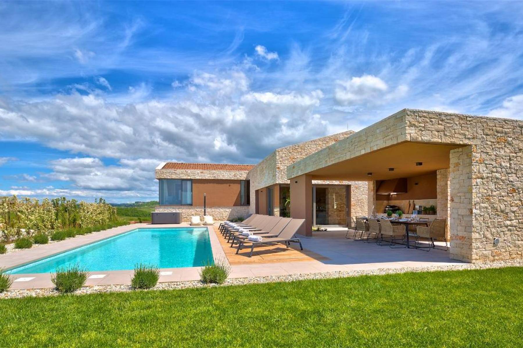 Представеният имот е луксозна вила с площ 324 м², разположена в спокойния и престижен район Бртонигла, Хърватия. Обградена от други елегантни резиденции, тя предлага комфорт и уединение сред природата. Сградата се простира на три нива, хармонично вписана в просторна градина с площ почти две хиляди квадратни метра. Характерна за нея е почти изцяло каменната фасада, която придава стил и здравина на цялата конструкция. Този имот е идеално предложение за хора, търсещи съчетание на висок стандарт с контакт с естествената околна среда.