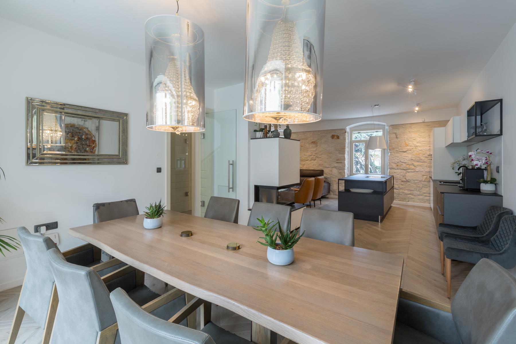 Мазето с площ над 100 м² може да бъде предназначено за допълнително жилищно пространство или място за отдих. Партерът с просторна дневна и кухня осигурява удобни условия за живот и срещи с семейство или приятели. На първия етаж има светли спални с достъп до бани, което гарантира уединение и комфорт. Каменните стени подчертават историческия характер на сградата, като същевременно са приложени модерни инсталационни решения.