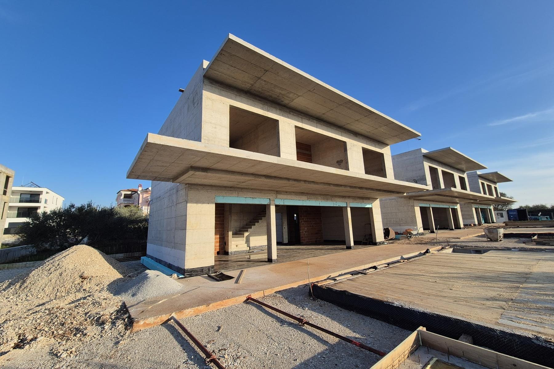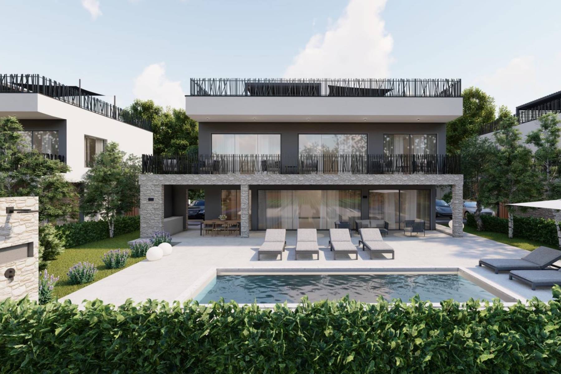 Три близнаци вили на един терен позволяват да се насладите на уникална гледка към околността и морето. Проектът предвижда функционални решения в жилищното пространство, които съчетават естетика с практичност. Партерът на сградата включва вход, гостна тоалетна, както и отворена кухня с остров, трапезария и хол, създаващи пространство, идеално за прекарване на време със семейството или приятели.