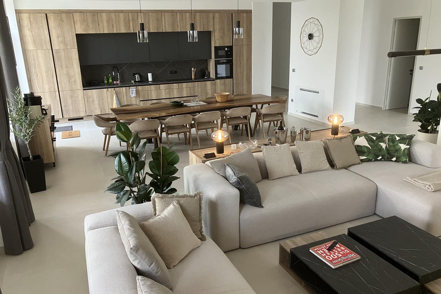 Обградена от добре поддържана градина с площ 1370 м², собствеността създава усещане за частен оазис на спокойствието. От имота се открива обширна гледка към маслинови горички и известни лозя, което внася атмосфера на хармония с природата. Интериорът е проектиран като отворено дневно пространство, където кухнята, трапезарията и холът плавно се свързват, улеснявайки семейните срещи и тържества. Това е изключително предложение за хора, търсещи удобство и характер в спокойно, климатично обкръжение.