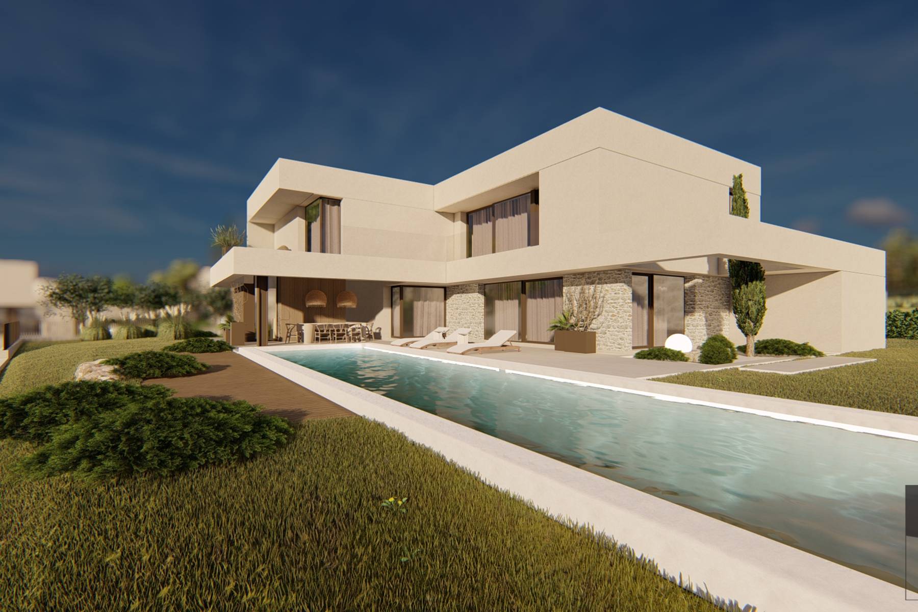 Офертата включва самостоятелна къща, която благодарение на своя план може комфортно да побере семейство. Пространството е внимателно разпределено на два етажа. На партера има просторна дневна с кухненски бокс и изход към терасата и басейна. Освен това домът разполага с удобни спални и бани, осигуряващи уединение и комфорт за всички членове на домакинството.