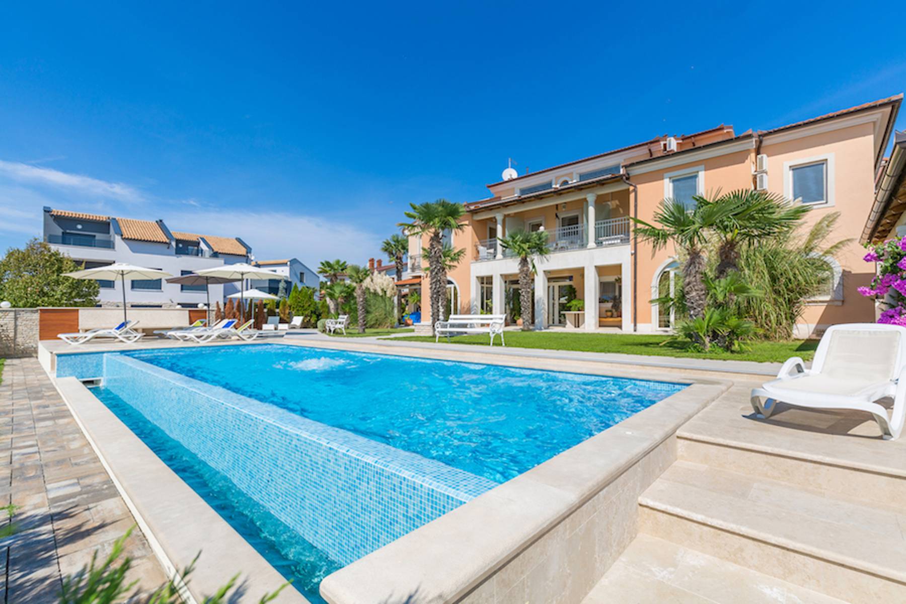 Този луксозен имот се намира в престижната, крайморска част на Медулин. От центъра на града го делят само петстотин метра, което осигурява удобен достъп до местните забележителности. От известния плаж Бижеца е на кратка разходка, което прави това място идеално за релакс и отдих. Вилата е проектирана с мисъл за комфорт и уединение, като разполага с осем уникални апартамента, които позволяват удобно живеене или отдаване под наем.
