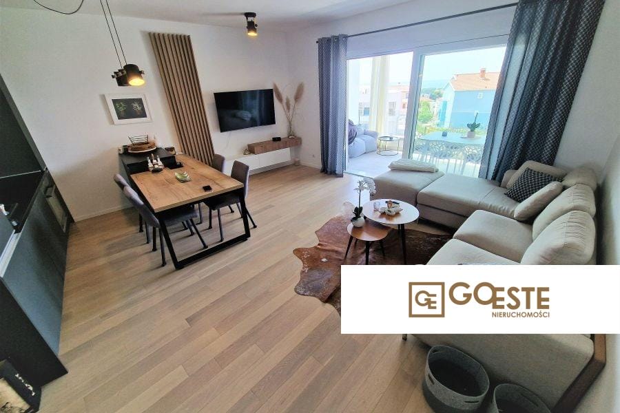 Изключителна оферта на пазара на недвижими имоти. За продажба луксозен апартамент, разположен в живописния град Крк, с панорамна гледка към морето. Този елегантен, напълно обзаведен имот с площ от 80,35 м2 впечатлява със своята добре обмислена архитектура и модерен дизайн. Намира се на първи етаж, което осигурява не само удобен достъп, но и отлични гледки. Апартаментът се състои от просторна дневна, модерна кухня с трапезария, две комфортни спални и две стилни бани. Допълнително предимство е голямата тераса, която е идеално място за релакс с изглед към кристалните води на Адриатика. Всеки детайл на сградата е внимателно обмислен, а използваните материали от най-високо качество гарантират комфорт за дълги години. Имотът представлява отлична възможност както за хора, търсещи спокойно място за почивка, така и като инвестиция за туристически наем.