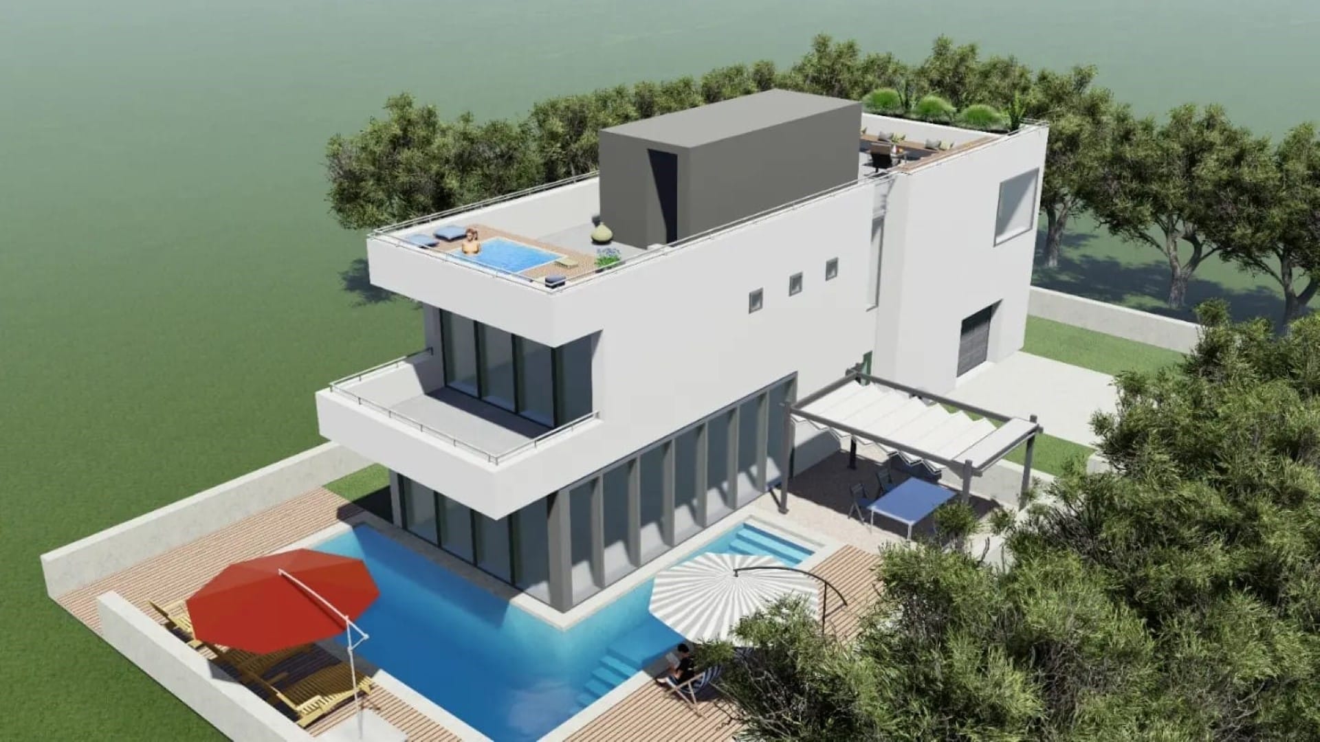 За продажба е наличен изключително атрактивен имот – модерен дом, който впечатлява с дизайна и местоположението си. Обектът, който е в процес на строителство, ще бъде готов за ползване в края на 2023 година. Идеален е за хора, които желаят да се наслаждават на комфорт и лукс на хърватското крайбрежие. Общата площ на дома е 311,80 м², с просторна планировка, съчетаваща функционалност и естетика. Прекрасната морска гледка и близостта до плажа осигуряват незабравими преживявания, а просторната тераса на покрива и басейнът носят радост и релакс по всяко време на деня. Имотът се отличава с висококачествени строителни материали и модерни технологични решения, което го прави идеално място както за постоянно живеене, така и за ваканционна инвестиция.