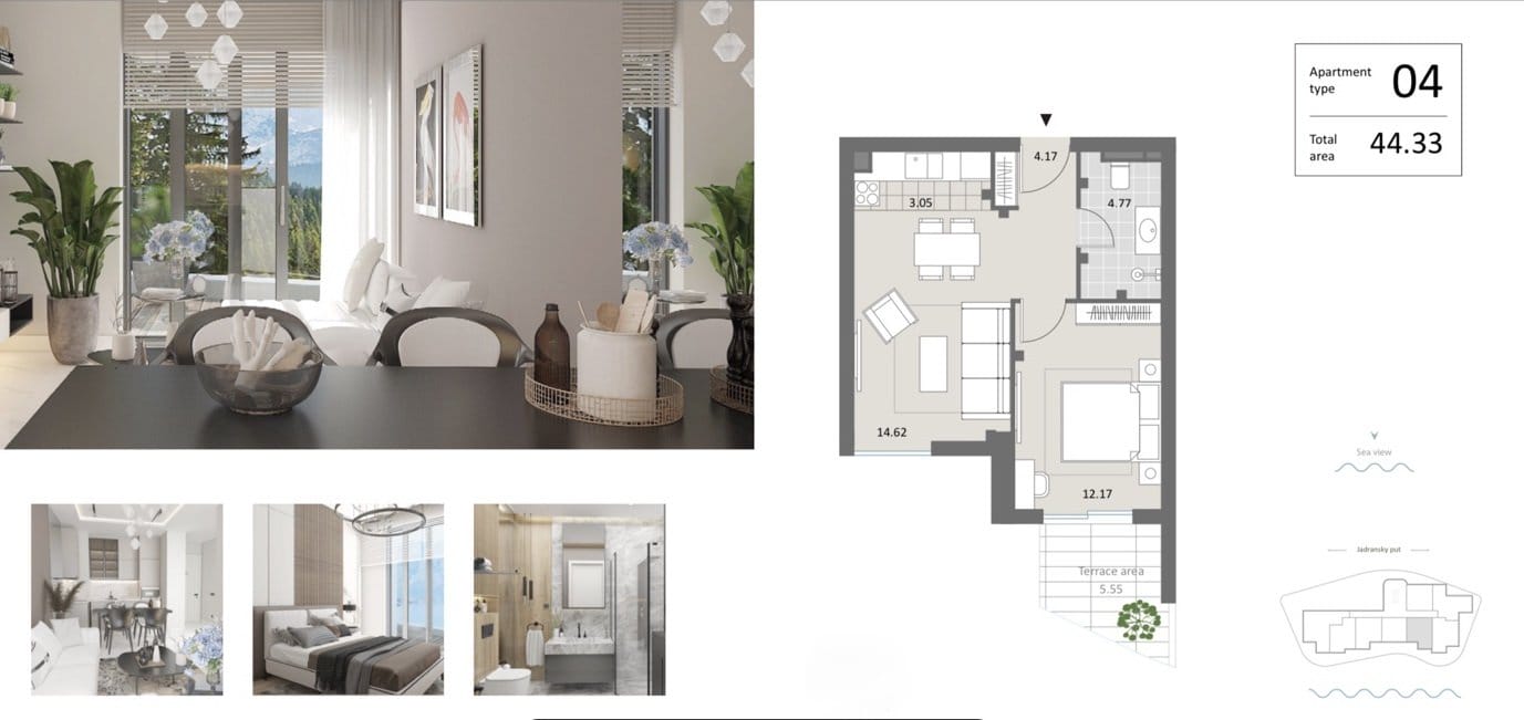 Апартаментът се намира на третия етаж в комплекса, който предлага 60 апартамента с различна площ, включително просторни пентхауси. Всеки от тях ще бъде напълно обзаведен и оборудван с техника от най-високо качество.