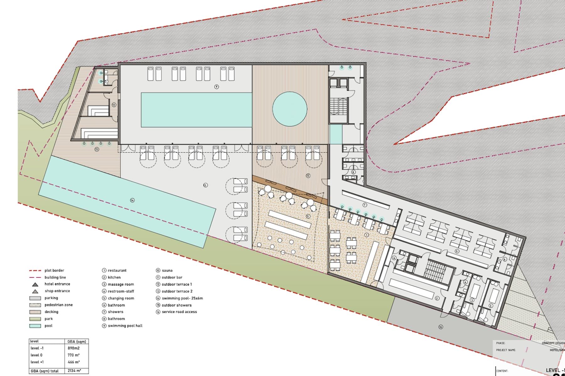 В концептуалните проекти влиза луксозен жилищен комплекс, състоящ се от 22 вили с частни басейни, 54 редови къщи оборудвани с басейни и 24 апартамента. Алтернативно е предложено изграждането на хотел с три етажа и обща площ над 2 хиляди квадратни метра. В обекта могат да бъдат разположени лоби, рецепция, както и търговски и гастрономически обекти.