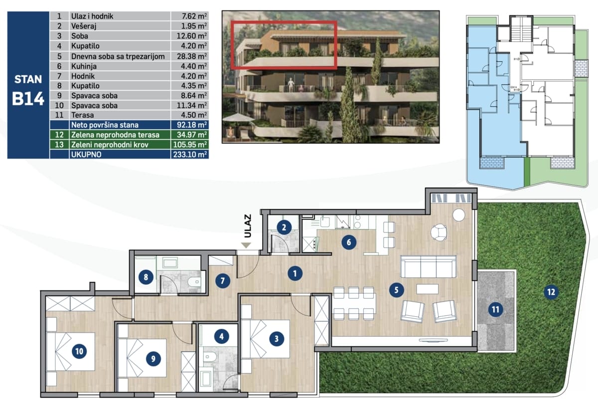 Започването на нов етап от живота в пентхаус в Котор е сбъдване на мечтата за елегантен и функционален дом. С площ от 233 м2 той предлага три комфортни стаи и три бани, които ще удовлетворят нуждите на цялото семейство.