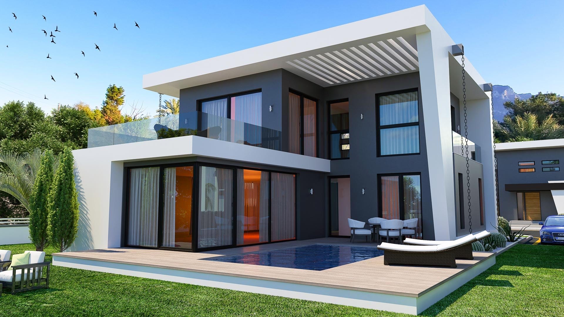 Елегантната двуетажна къща е проектирана с мисъл за модерен начин на живот, предлагайки оптимално пространство и функционалност.